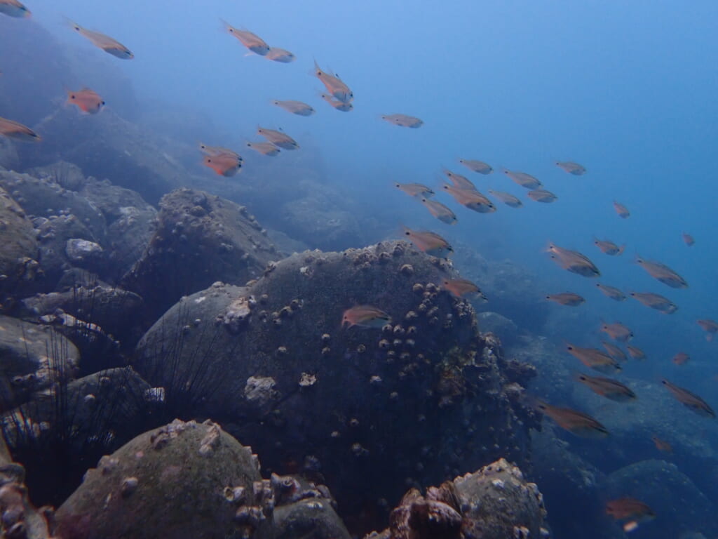 空が暗く、水中は暗く感じましたし、濁ってはいましたが、水温16度〜17度とこの時期の音海でこの水温は高い。