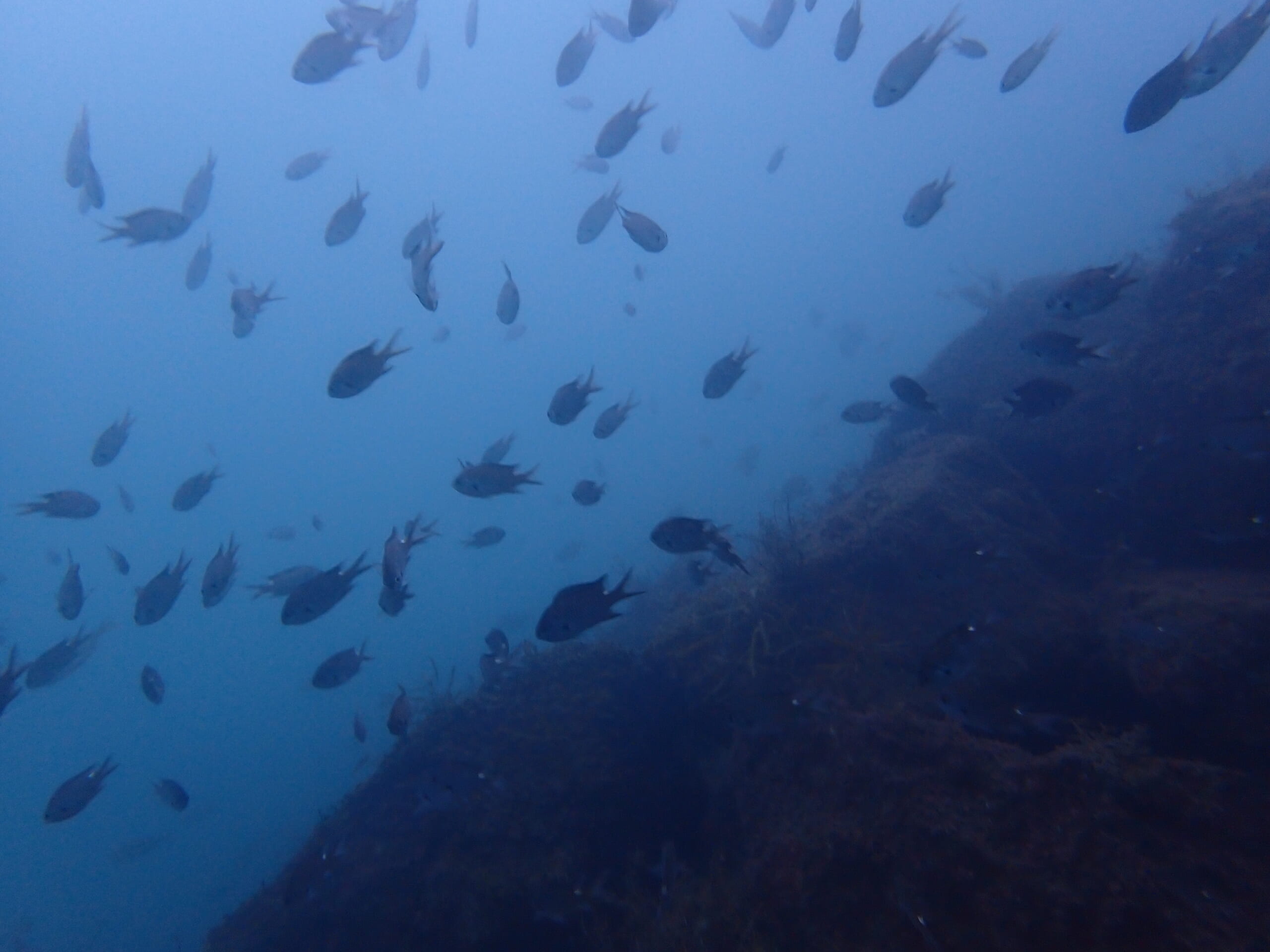 空が暗く、水中は暗く感じましたし、濁ってはいましたが、水温16度〜17度とこの時期の音海でこの水温は高い。