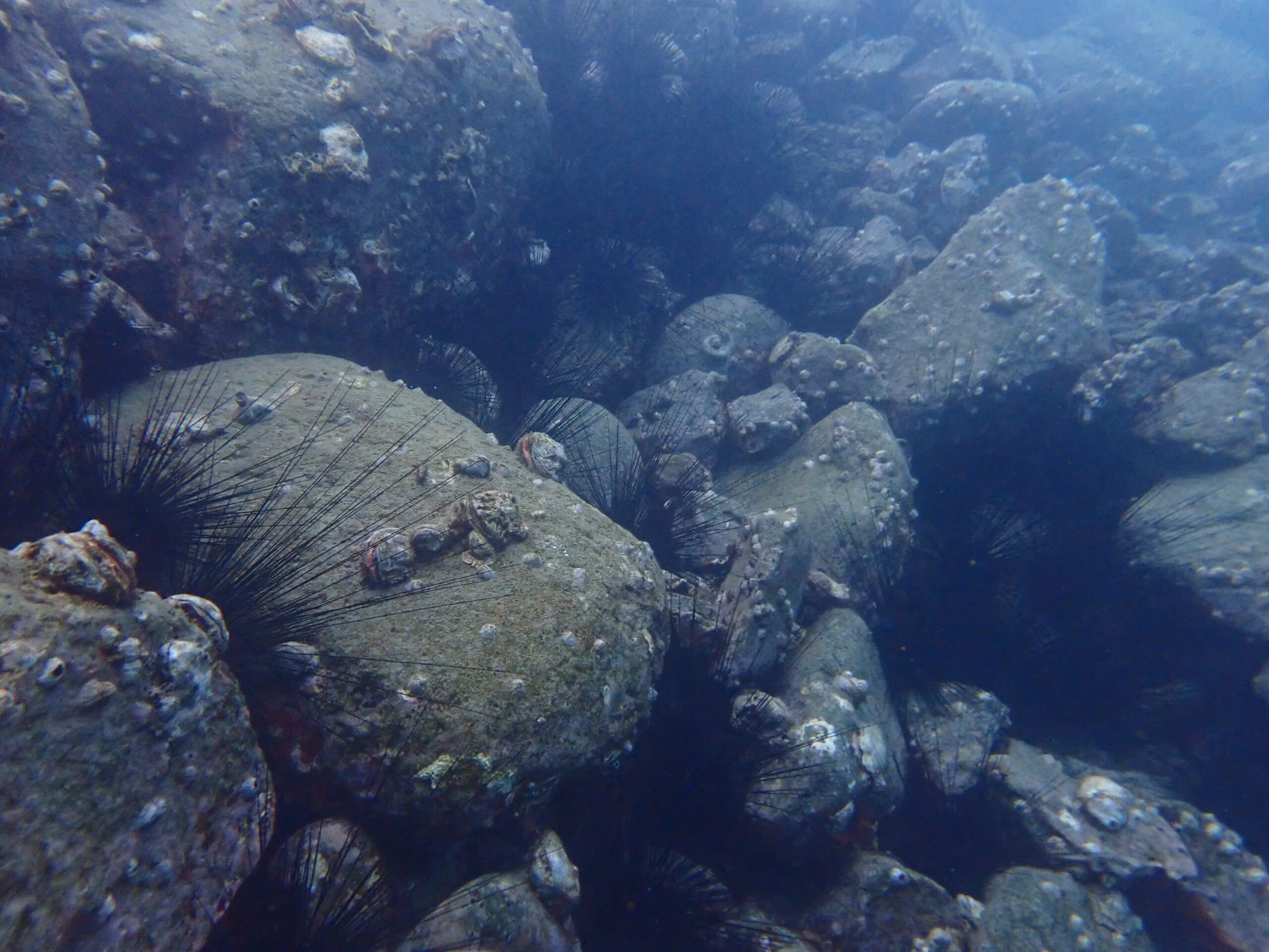 ガンガゼの長くて鋭いトゲはドライスーツやウェットスーツも貫通するほどで、毒があり、刺さると激痛を伴います。(経験談)