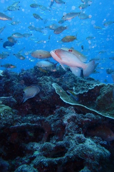 ここでは、ハタタテハゼ、スミレナガハナダイ(性転換中)アマミスズメダイ、アオギハゼ、アカメハゼ、ガラスハゼ、オオモンカエルアンコウなどが見れました。
