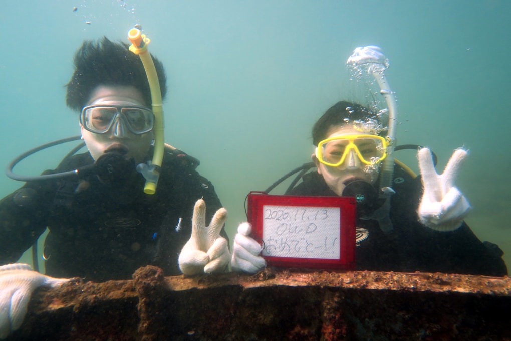 水面での動き方やウエイト調整、潜降時の空気の抜き方や水中での空気調節、体の振り回し方などなど初めてとは思えないほど上手にこなしていました。