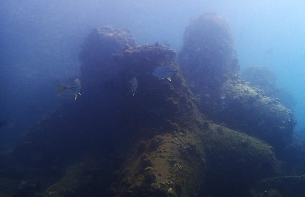 なんとなんと!!画像は悪いが、12月の音海の浅場に三匹のギンガメアジ幼魚!!(音海初!!)